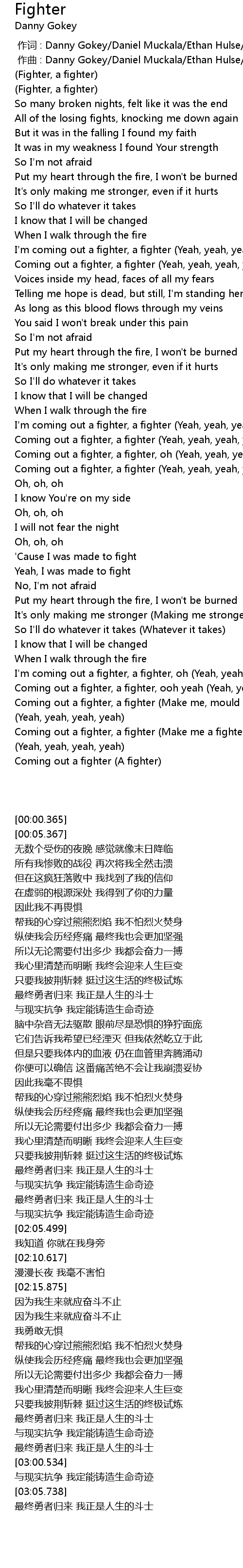 | [03:01.878] | Coming out a fighter, a fighter Make me a fighter |