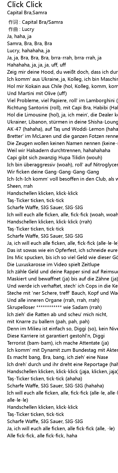 | [01:19.21] | Ich will euch alle ficken, alle, fickfick woah, woah |