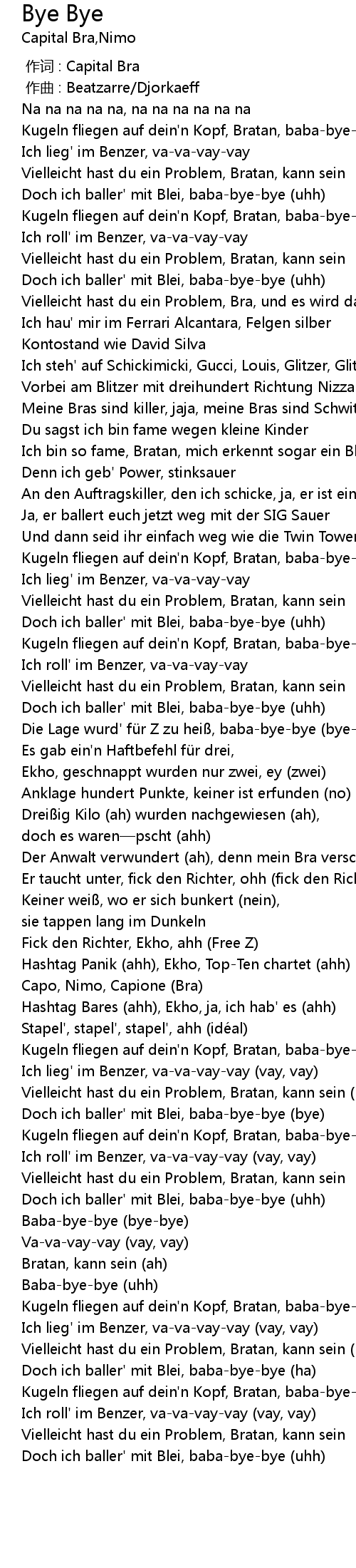 | [02:33.00] | Kugeln fliegen auf dein'n Kopf, Bratan, baba-bye-bye (bye-bye) |