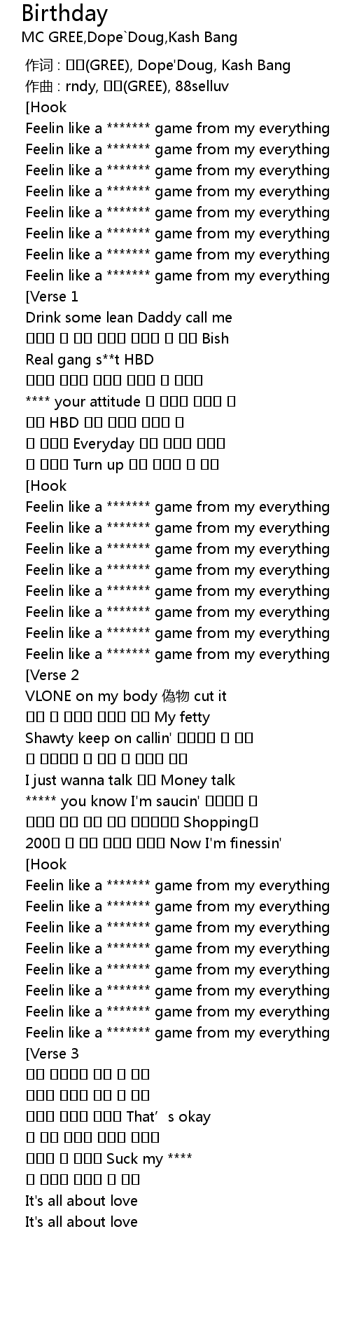 | [02:14.955] | Feelin like a ******* game from my everything |
