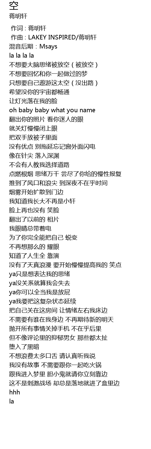 | [00:01.000] | 作曲 : LAKEY INSPIRED/蒋明轩 |