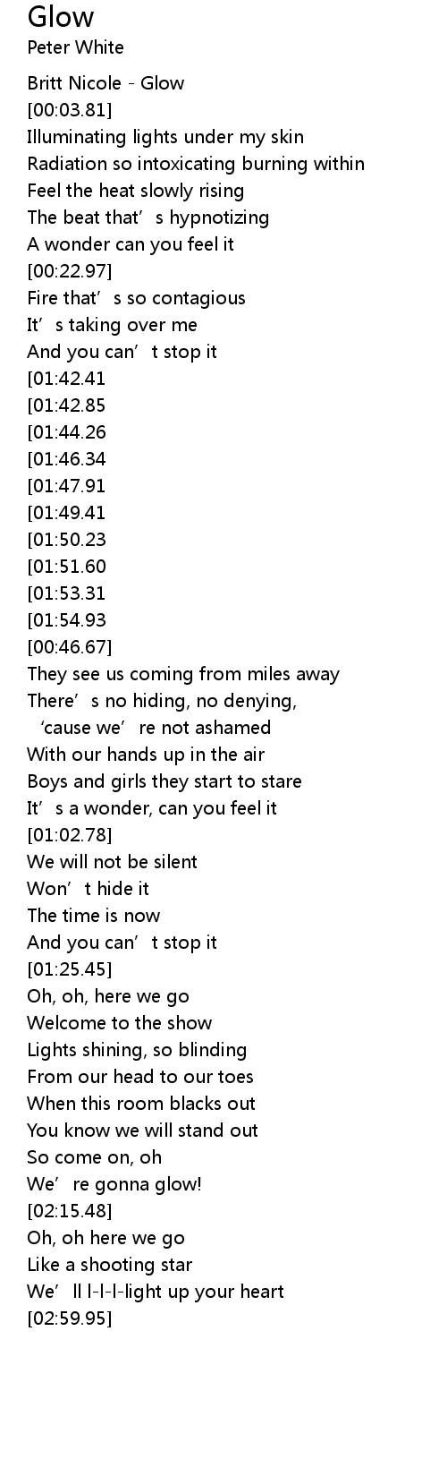 | [02:01.79][01:46.34][01:14.14][00:34.42] | Glow, glow |
