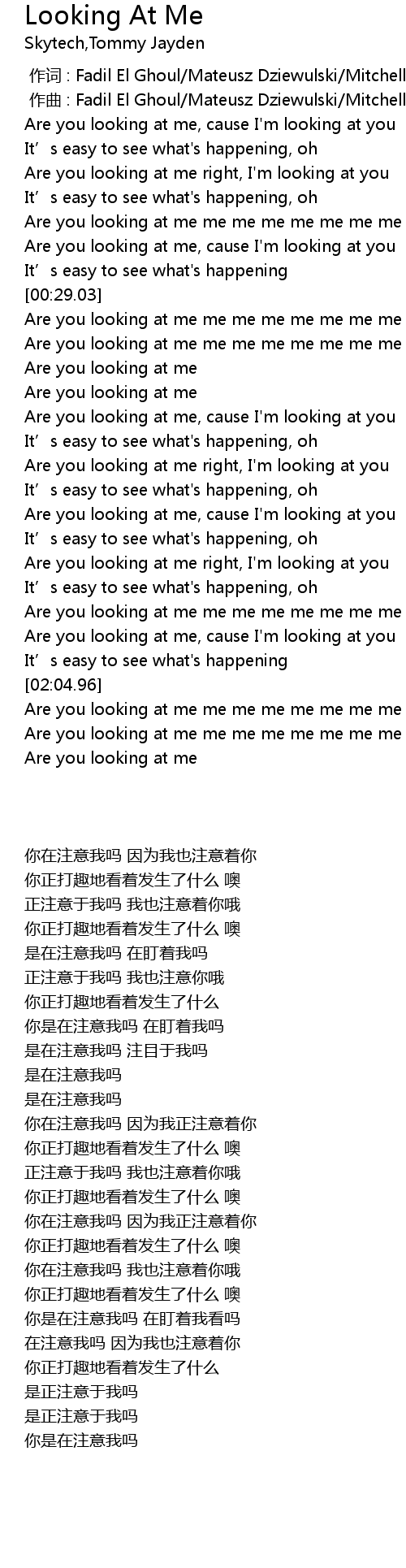 | [02:20.29] | Are you looking at me me me me me me me me me me |