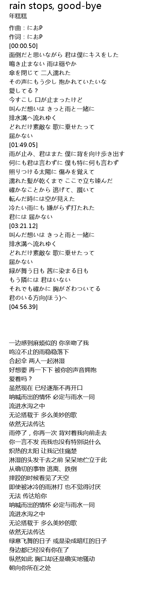 | [00:40.37] | 鸣泣不止的雨稳稳落下 |