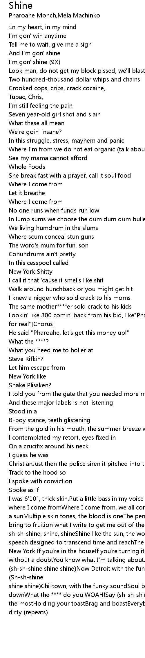 I was 6'10", thick skin,Put a little bass in my voice like pitch bend'Cause where I come fromWhere I come from, we all come fromSky, moon, stars, earth and a sunMultiple skin tones, the blood is oneThe pen is the ammo to my automaticI bring to fruition what I write to get me out of the slumsAnd I'ma shine, sh-sh-shine, shine, shineShine like the sun, the world is mineEach line is speech designed to transcend time and reachThe unborn and transform your mindAnd I'ma shineShine[Chorus]New York If you're in the houseIf you're turning it out without a doubtYou know what I'm talking aboutJust scream and shoutEverybody say (sh-sh-shine shine shine)Now Detroit with the funky beatsGettin' wild on the streetSee the mark of the beastSay f*** the police[What up, X?](Sh-sh-shine shine shine)Chi-town, with the funky soundSoul by the pound, just get on downWhat the **** do you WOAH!Say (sh-sh-shine shine shine)West coast side with the mostHolding your toastBrag and boastEverybody say shine shine shineDirty dirty (repeats) |
