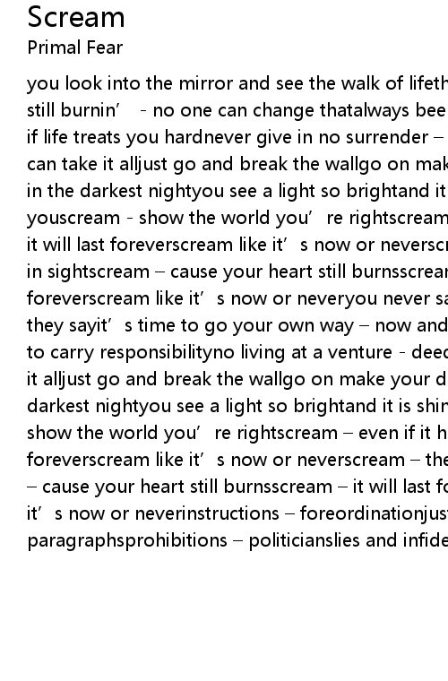 | you look into the mirror and see the walk of lifethe flame in your heart’s still burnin’ - no one can change thatalways been a type of winner no matter if life treats you hardnever give in no surrender – leading - succeedingyou can take it alljust go and break the wallgo on make your dreams come truecause in the darkest nightyou see a light so brightand it is shining just for youscream - show the world you’re rightscream – even if it hurtsscream – it will last foreverscream like it’s now or neverscream – there’s a goal in sightscream – cause your heart still burnsscream – it will last foreverscream like it’s now or neveryou never saw the reason in doing what they sayit’s time to go your own way – now and foreveryou never were afraid to carry responsibilityno living at a venture - deeds instead wordsyou can take it alljust go and break the wallgo on make your dreams come truecause in the darkest nightyou see a light so brightand it is shining just for youscream - show the world you’re rightscream – even if it hurtsscream – it will last foreverscream like it’s now or neverscream – there’s a goal in sightscream – cause your heart still burnsscream – it will last foreverscream like it’s now or neverinstructions – foreordinationjust laws and paragraphsprohibitions – politicianslies and infidelity |