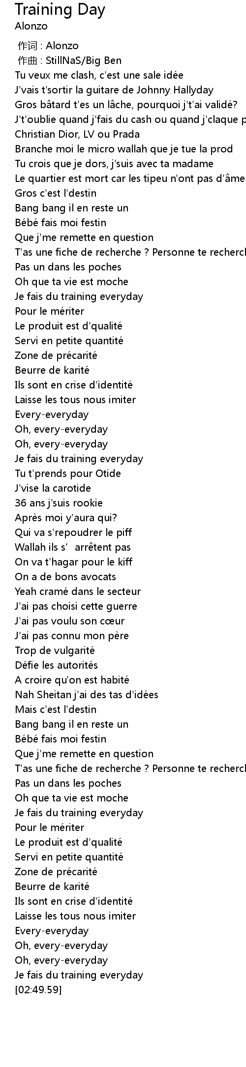 | [02:46.72] | Je fais du training everyday |