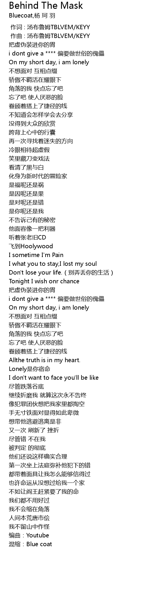 | [02:38.39] | 都带着面具让我怎么能够信得过 |