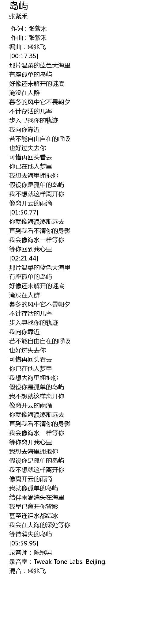 | [06:04.38] | 录音室:Tweak Tone Labs. Beijing. |
