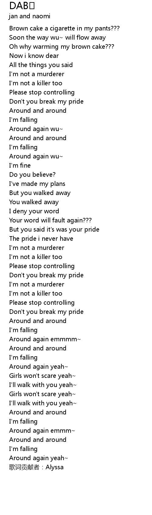 | [00:34.02] | Brown cake a cigarette in my pants??? |