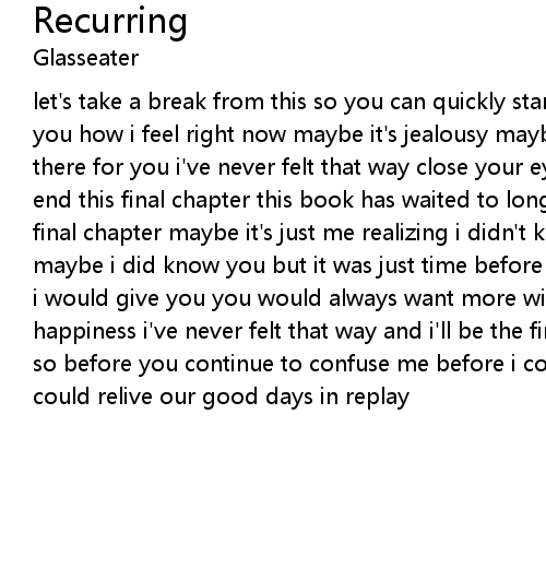 let's take a break from this so you can quickly start with that if i could show you how i feel right now maybe it's jealousy maybe it's me knowing i couldn't be there for you i've never felt that way close your eyes and make a wish so we can end this final chapter this book has waited to long to close please end this final chapter maybe it's just me realizing i didn't know you i just craved you maybe i did know you but it was just time before you realized no matter how much i would give you you would always want more with me tried to capture as much happiness i've never felt that way and i'll be the first one to say i told you so before you continue to confuse me before i continue to confuse me i wish i could relive our good days in replay