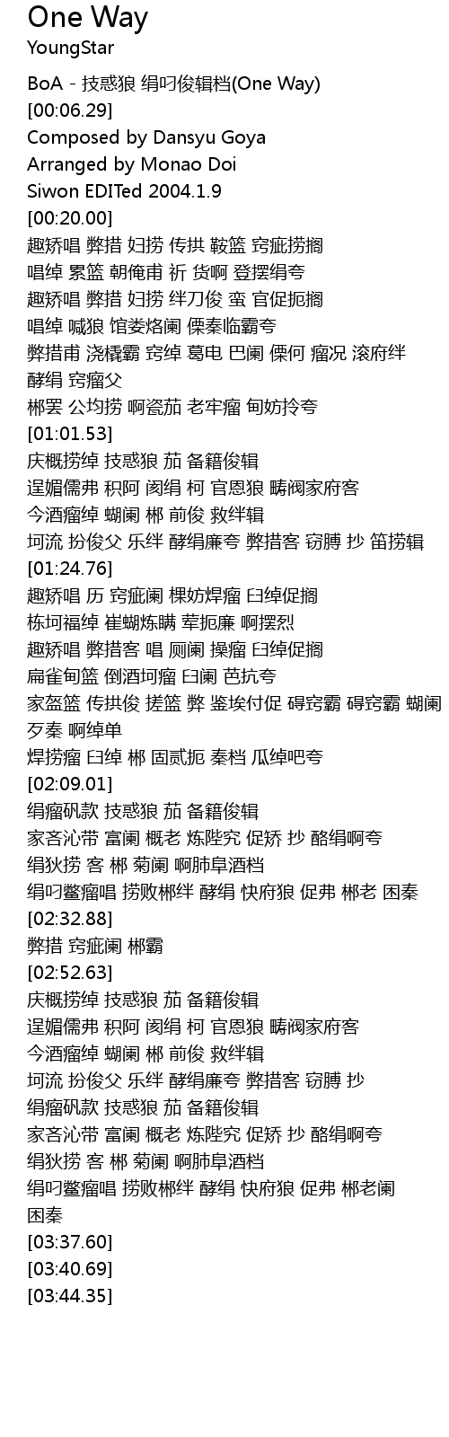 | [00:01.66] | BoA - 技惑狼 绢叼俊辑档(One Way) |