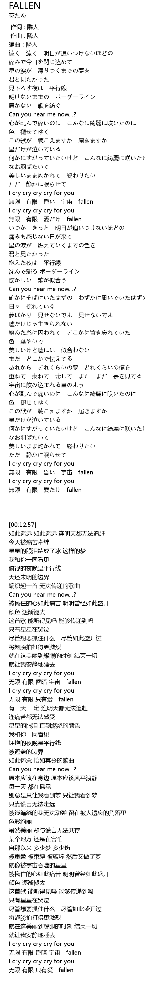 | [01:51.16] | 无限 有限 昏暗 宇宙 fallen |