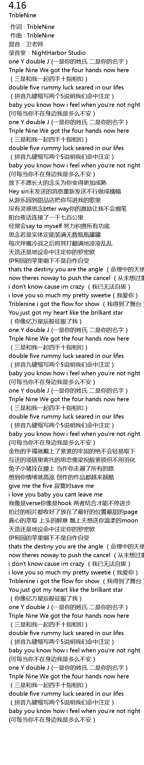 | [00:21.162] | Triple Nine We got the four hands now here sān shì hé wǒ yì qǐ sì shǒu shí zhǐ xiāng kòu |