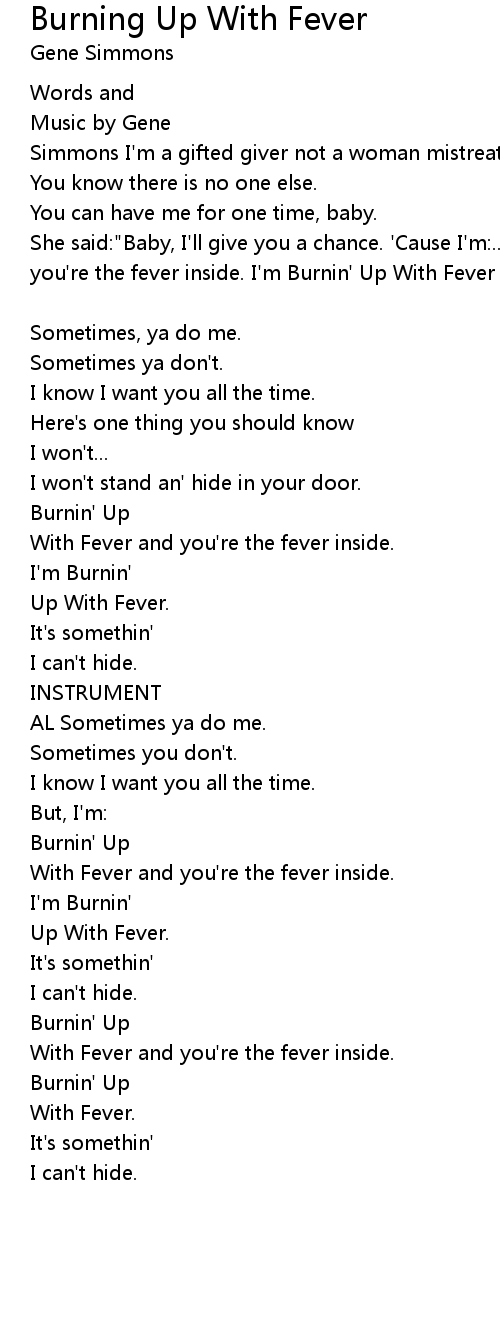 She said:"Baby, I'll give you a chance. 'Cause I'm:... Burnin' Up With Fever and you're the fever inside. I'm Burnin' Up With Fever It's somethin' I can't hide." |