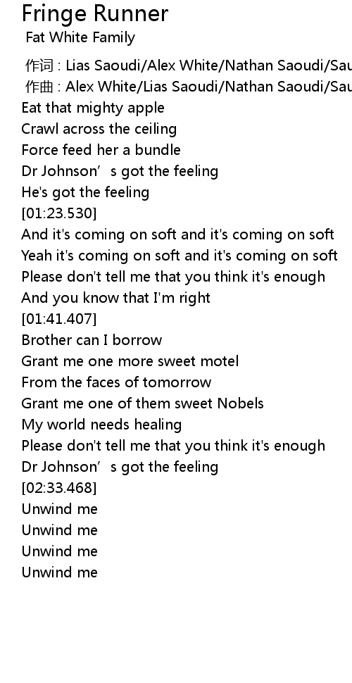 | [00:01.000] | zuo qu : Alex White Lias Saoudi Nathan Saoudi Saul Adamczewski |