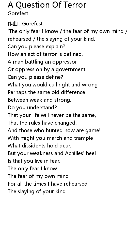| 'The only fear I know / the fear of my own mind / tor all the times I have rehearsed / the slaying of your kind.' | |