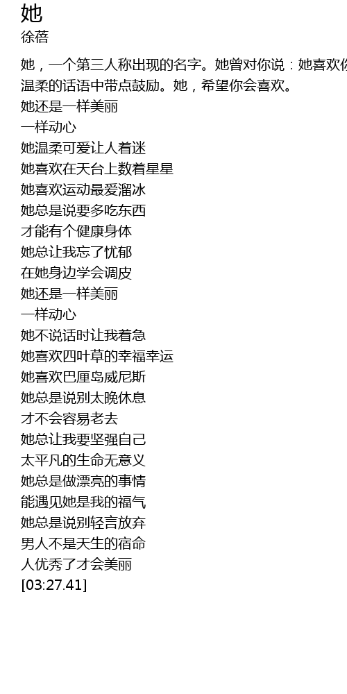 | [00:00.77] | 她,一个第三人称出现的名字。她曾对你说:她喜欢你、她关心你... 温柔的话语中带点鼓励。她,希望你会喜欢。 |