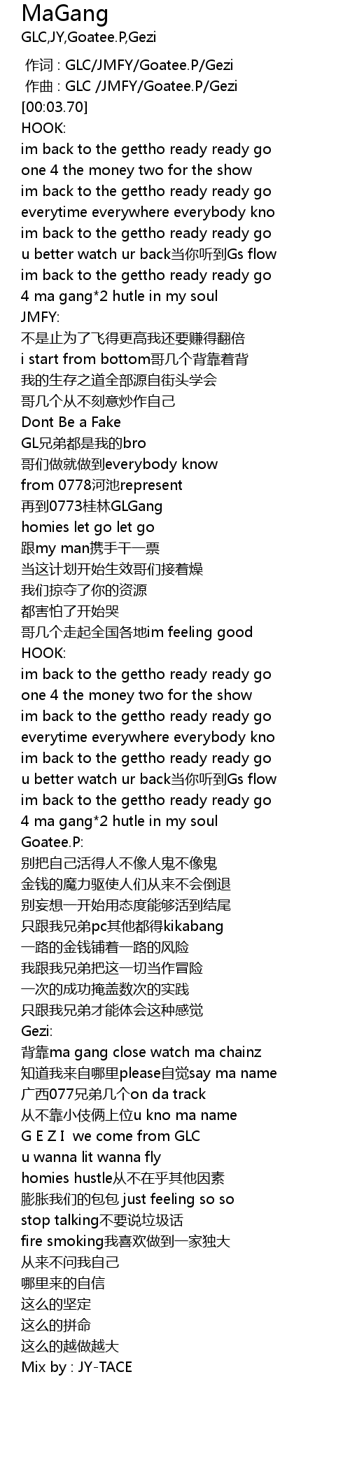 | [00:00.000] | 作词 : GLC/JMFY/Goatee.P/Gezi |