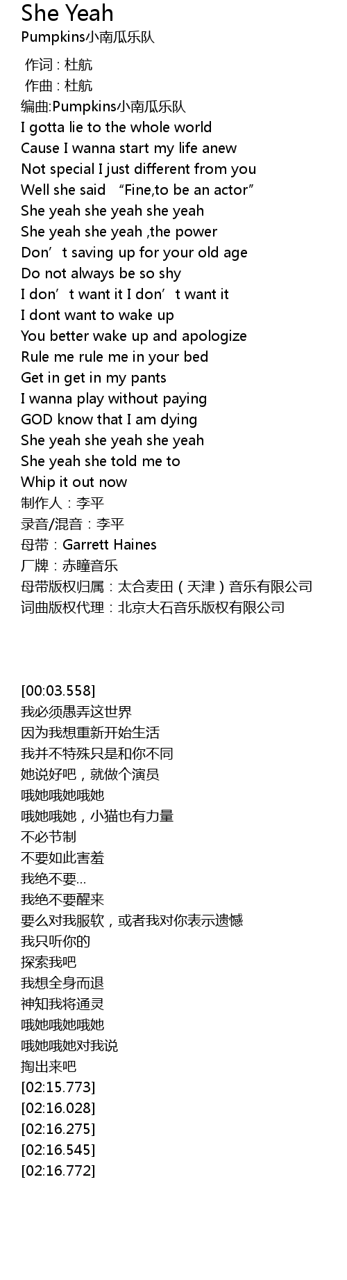 | [00:03.558] | 编曲:Pumpkins小南瓜乐队 |