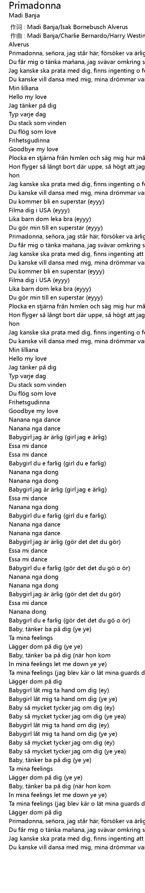| [00:00.84] | Primadonna, señora, jag står här, försöker va ärlig |