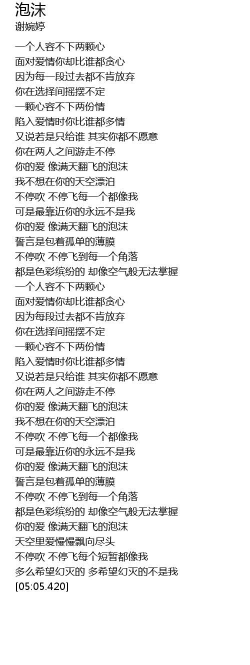 | [03:32.330] | 你的爱 像满天翻飞的泡沫 |