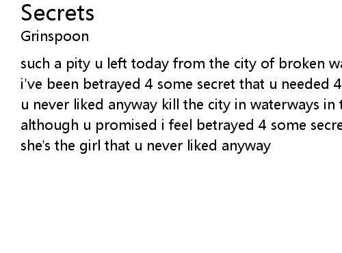 | such a pity u left today from the city of broken waves all though u promised i've been betrayed 4 some secret that u needed 4 some secret she's the girl that u never liked anyway kill the city in waterways in the shitty brown golden waves although u promised i feel betrayed 4 some secret that u needed 4 some secret she's the girl that u never liked anyway |