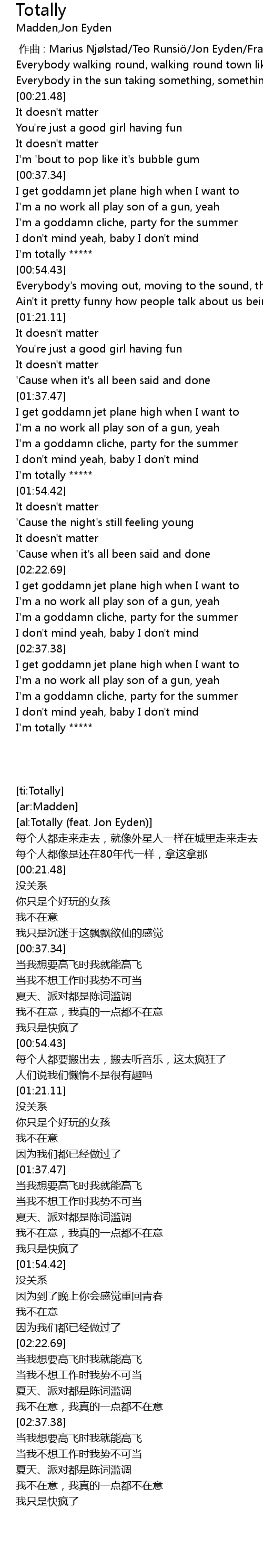 | [02:45.83] | I'm a goddamn cliche, party for the summer |