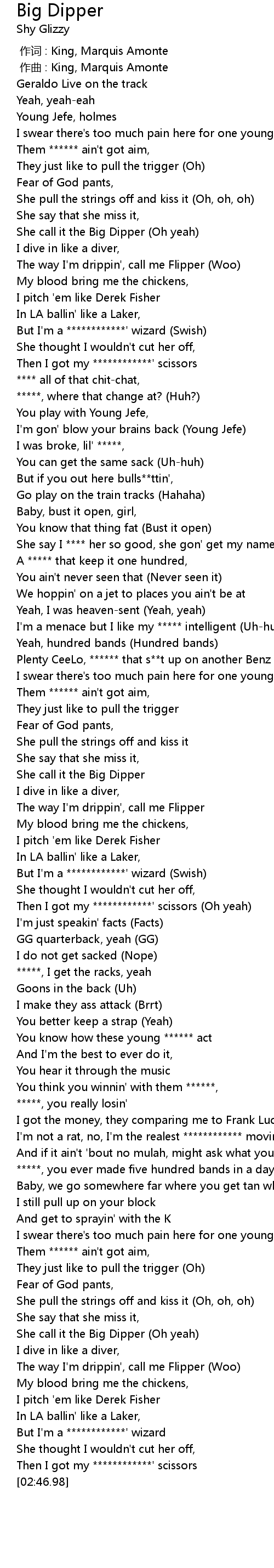 | [00:23.41] | She call it the Big Dipper (Oh yeah) |