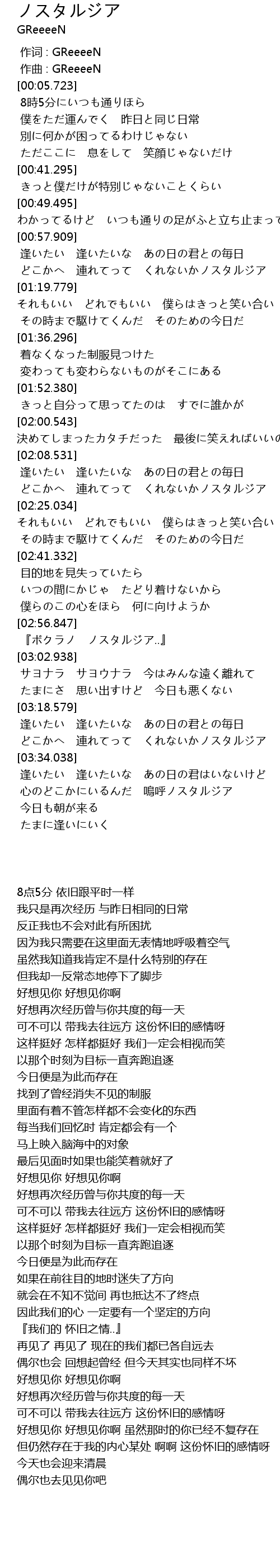 | [03:42.100] | 心のどこかにいるんだ 嗚呼ノスタルジア |