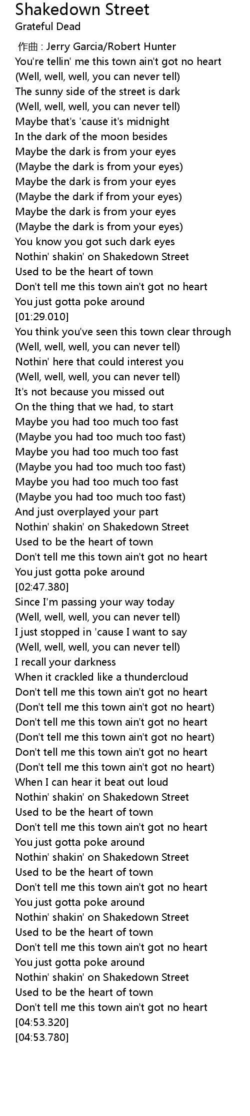 | [02:29.730] | Nothin' shakin' on Shakedown Street |