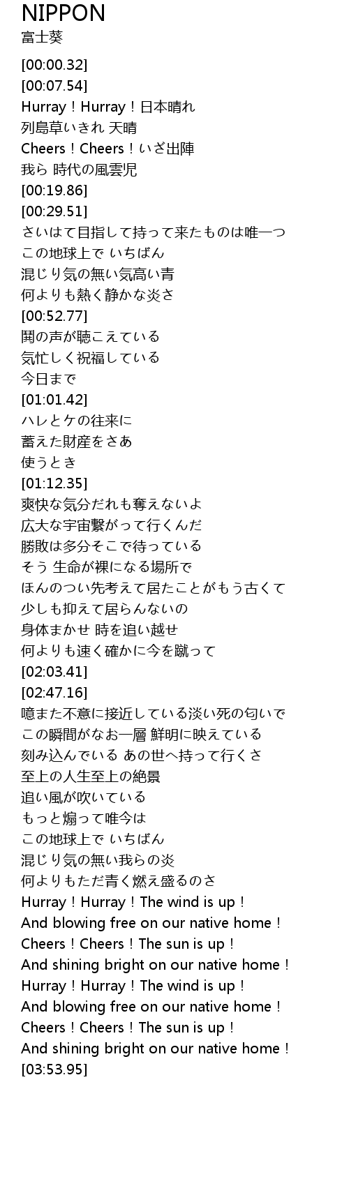 | [03:31.66] | Hurray! Hurray! The wind is up! |