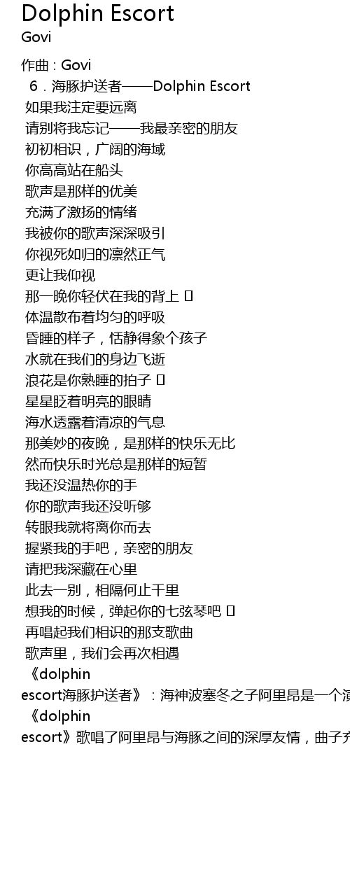 | dolphin escort gē chàng le a lǐ áng yǔ hǎi tún zhī jiān de shēn hòu yǒu qíng, qǔ zi chōng mǎn le yǒu qíng yú yuè de yùn wèi, fǎng fú kàn dào le a lǐ áng hé hǎi tún zài yì qǐ chéng fēng pò làng de qíng jǐng. |