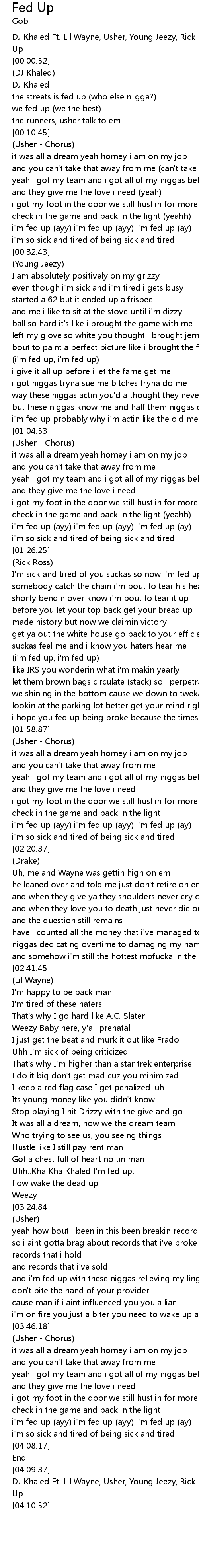 | [00:00.02] | DJ Khaled Ft. Lil Wayne, Usher, Young Jeezy, Rick Ross Drake Fed Up |