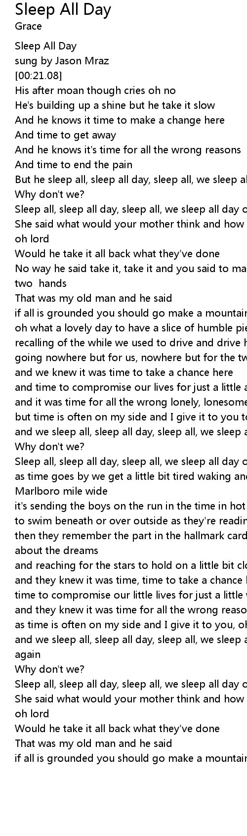 | [03:30.67] | and we sleep all, sleep all day, sleep all, we sleep all day over again |