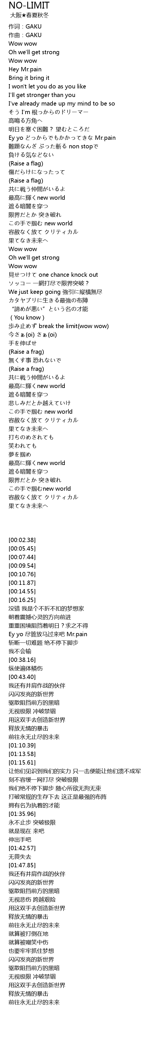 | [01:36.28] | 歩み止めず break the limit(wow wow) |