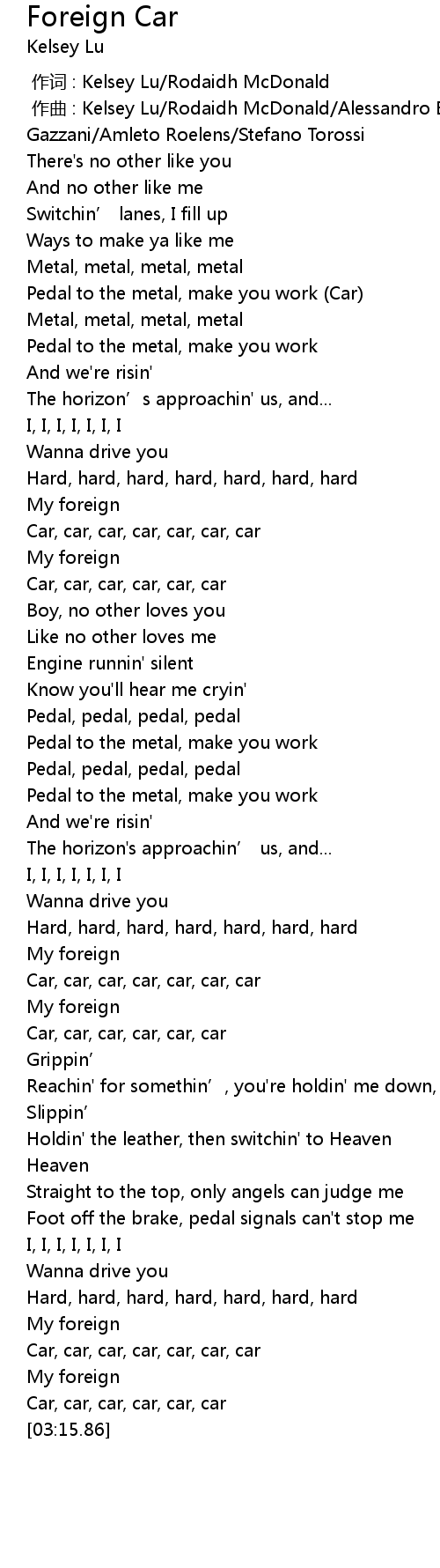 | [00:46.05] | Pedal to the metal, make you work (Car) |