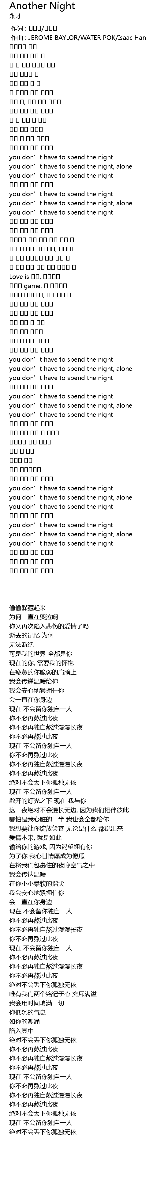 | [00:01.000] | 作曲 : JEROME BAYLOR/WATER POK/Isaac Han |