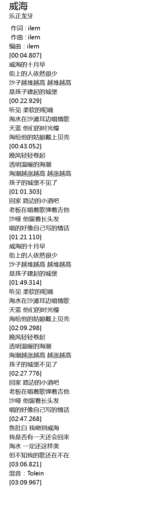| [02:47.938] | 鱼肚白 我吻别威海 |