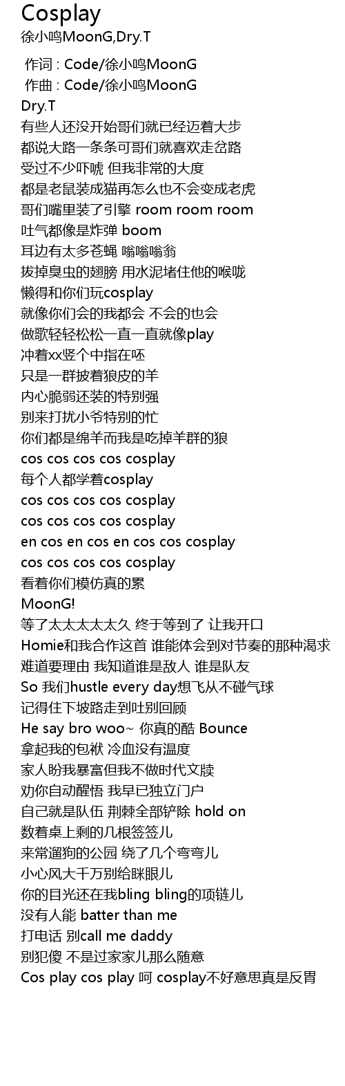 | [02:00.268] | Cos play cos play 呵 cosplay不好意思真是反胃 |