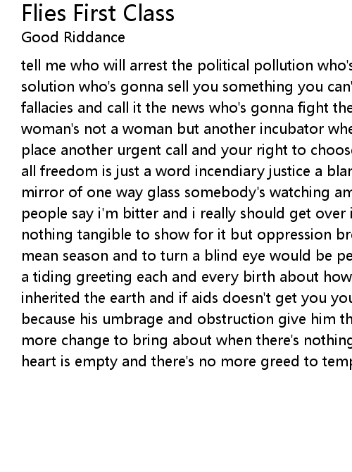 tell me who will arrest the political pollution who's coming up with the eminent solution who's gonna sell you something you can't use who can broadcast fallacies and call it the news who's gonna fight the almighty legislature when a woman's not a woman but another incubator when the choleric voice of millions place another urgent call and your right to choose is taken leaving no choice at all freedom is just a word incendiary justice a blank ideal our novel paradigm mirror of one way glass somebody's watching america flies first class some people say i'm bitter and i really should get over it an angry young man with nothing tangible to show for it but oppression breeds obsession like another mean season and to turn a blind eye would be personal treason in the sky there's a tiding greeting each and every birth about how the unenlightened have inherited the earth and if aids doesn't get you you can bet you neighbor will because his umbrage and obstruction give him the liberty to kill when there's no more change to bring about when there's nothing left to sing about and when my heart is empty and there's no more greed to tempt me america files first class