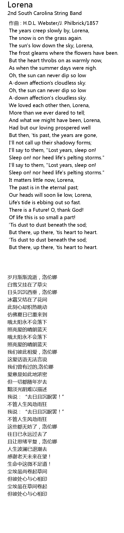 | [00:11.873] | The years creep slowly by, Lorena, |