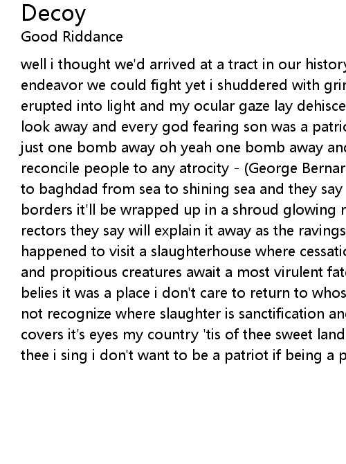 well i thought we'd arrived at a tract in our history where we'd fought every endeavor we could fight yet i shuddered with grim preconception as the cannonade erupted into light and my ocular gaze lay dehiscent it seemed that i could not look away and every god fearing son was a patriot and victory remained elusive just one bomb away oh yeah one bomb away and they say that customs will reconcile people to any atrocity - (George Bernard Shaw) from dachau to belfast to baghdad from sea to shining sea and they say that when fascism crosses our borders it'll be wrapped up in a shroud glowing red, white, and blue and our rectors they say will explain it away as the ravings of a passionate few well i happened to visit a slaughterhouse where cessation's redolence rose to the sky and propitious creatures await a most virulent fate which their pacific demeanor belies it was a place i don't care to return to whose chambers compassion would not recognize where slaughter is sanctification and humanity covers it's eyes covers it's eyes my country 'tis of thee sweet land of liberty of thee i sing of thee i sing i don't want to be a patriot if being a patriot means being like you |