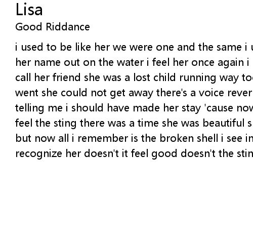 i used to be like her we were one and the same i used to hold her i used to know her name out on the water i feel her once again i used to be like her i used to call her friend she was a lost child running way too fast no matter where she went she could not get away there's a voice reverberating deep inside my head telling me i should have made her stay 'cause now there's no one but me and i feel the sting there was a time she was beautiful she had so much life to give but now all i remember is the broken shell i see in my nightmares i can hardly recognize her doesn't it feel good doesn't the sting feel good |