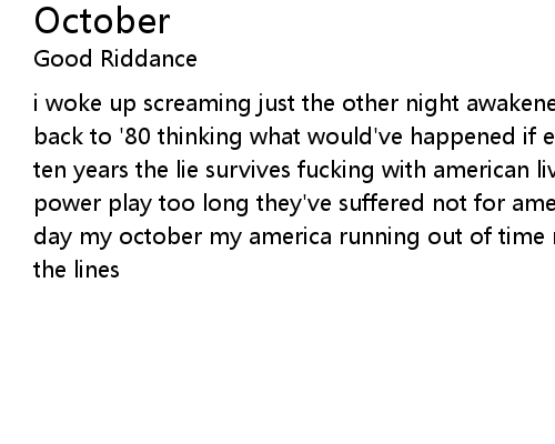 | i woke up screaming just the other night awakened by another dream i thought back to '80 thinking what would've happened if everything wasn't how it seemed ten years the lie survives fucking with american lives reduced to pawns in a power play too long they've suffered not for america just for a lead on election day my october my america running out of time my october my america read between the lines |