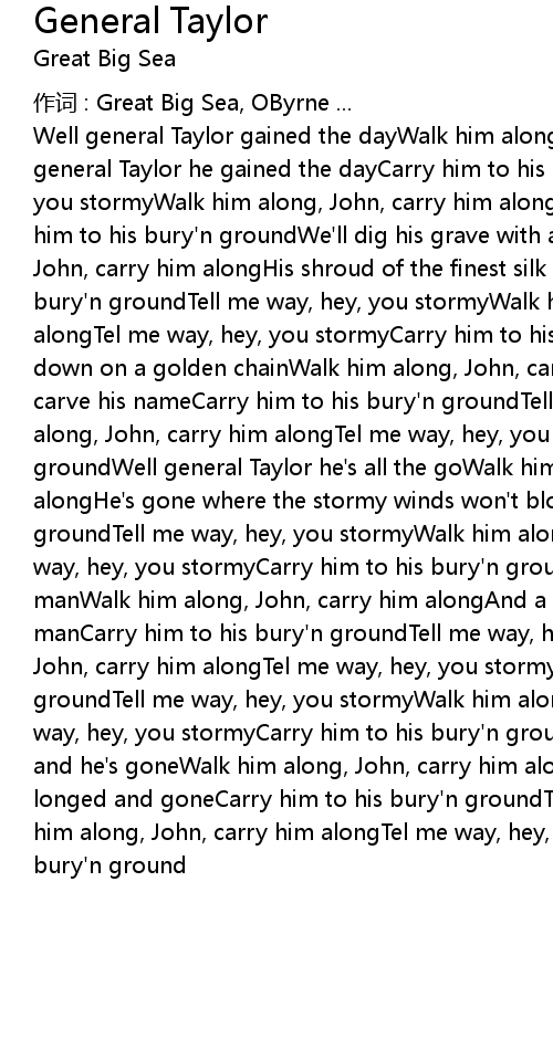 | Well general Taylor gained the dayWalk him along, John, carry him alongWell general Taylor he gained the dayCarry him to his bury'n groundTell me way, hey, you stormyWalk him along, John, carry him alongTel me way, hey, you stormyCarry him to his bury'n groundWe'll dig his grave with a silver spadeWalk him along, John, carry him alongHis shroud of the finest silk will be madeCarry him to his bury'n groundTell me way, hey, you stormyWalk him along, John, carry him alongTel me way, hey, you stormyCarry him to his bury'n groundWe'll lower him down on a golden chainWalk him along, John, carry him alongOn every inch we'll carve his nameCarry him to his bury'n groundTell me way, hey, you stormyWalk him along, John, carry him alongTel me way, hey, you stormyCarry him to his bury'n groundWell general Taylor he's all the goWalk him along, John, carry him alongHe's gone where the stormy winds won't blowCarry him to his bury'n groundTell me way, hey, you stormyWalk him along, John, carry him alongTel me way, hey, you stormyCarry him to his bury'n groundWell a point of run for every manWalk him along, John, carry him alongAnd a bloody great big barrel for shanty manCarry him to his bury'n groundTell me way, hey, you stormyWalk him along, John, carry him alongTel me way, hey, you stormyCarry him to his bury'n groundTell me way, hey, you stormyWalk him along, John, carry him alongTel me way, hey, you stormyCarry him to his bury'n groundWell general Taylor is dead and he's goneWalk him along, John, carry him alongWell general Taylor he's longed and goneCarry him to his bury'n groundTell me way, hey, you stormyWalk him along, John, carry him alongTel me way, hey, you stormyCarry him to his bury'n ground |