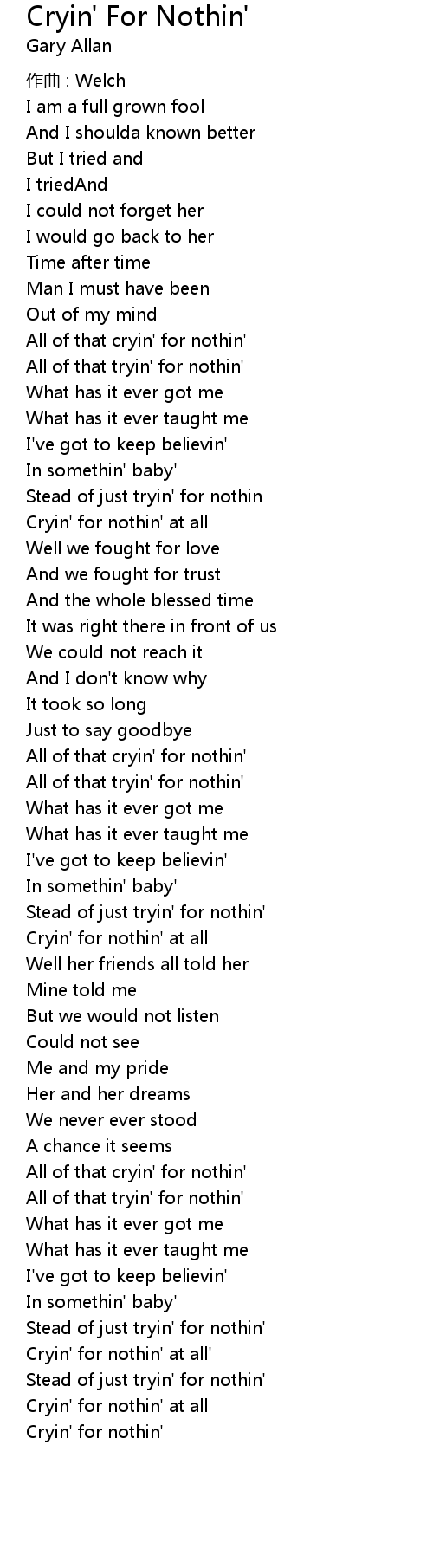 | Cryin' for nothin' at all' | |