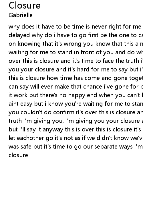 | why does it have to be time is never right for me what i gotta say cannot be delayed why do i have to go first be the one to cause the hurt both be holding on knowing that it's wrong you know that this aint easy but i know you're waiting for me to stand in front of you and do what you couldn't do confirm it's over this is closure and it's time to face the truth i'm giving you, i'm giving you your closure and it's hard for me to say but i'll say it anyway this is over this is closure how time has come and gone together we don't belong nothing we can say will ever make that chance i've gone for better or worst somehow we make it work but there's no happy end when you can't be friends you know that this aint easy but i know you're waiting for me to stand in front of you and do what you couldn't do confirm it's over this is closure and it's time to face the truth i'm giving you, i'm giving you your closure and it's hard for me to say but i'll say it anyway this is over this is closure it's all over it's time to let eachother go it's not as if we didn't know we've been holding on because it was safe but it's time to go our separate ways i'm giving you, i'm giving you closure |