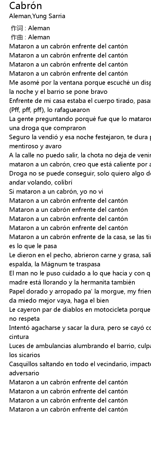 | [00:33.880] | Mataron a un cabró n enfrente del cantó n |