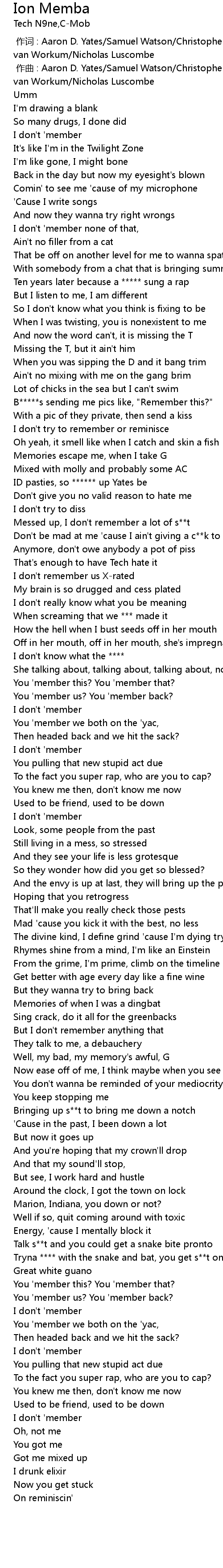 | [00:57.10] | Messed up, I don't remember a lot of s**t |